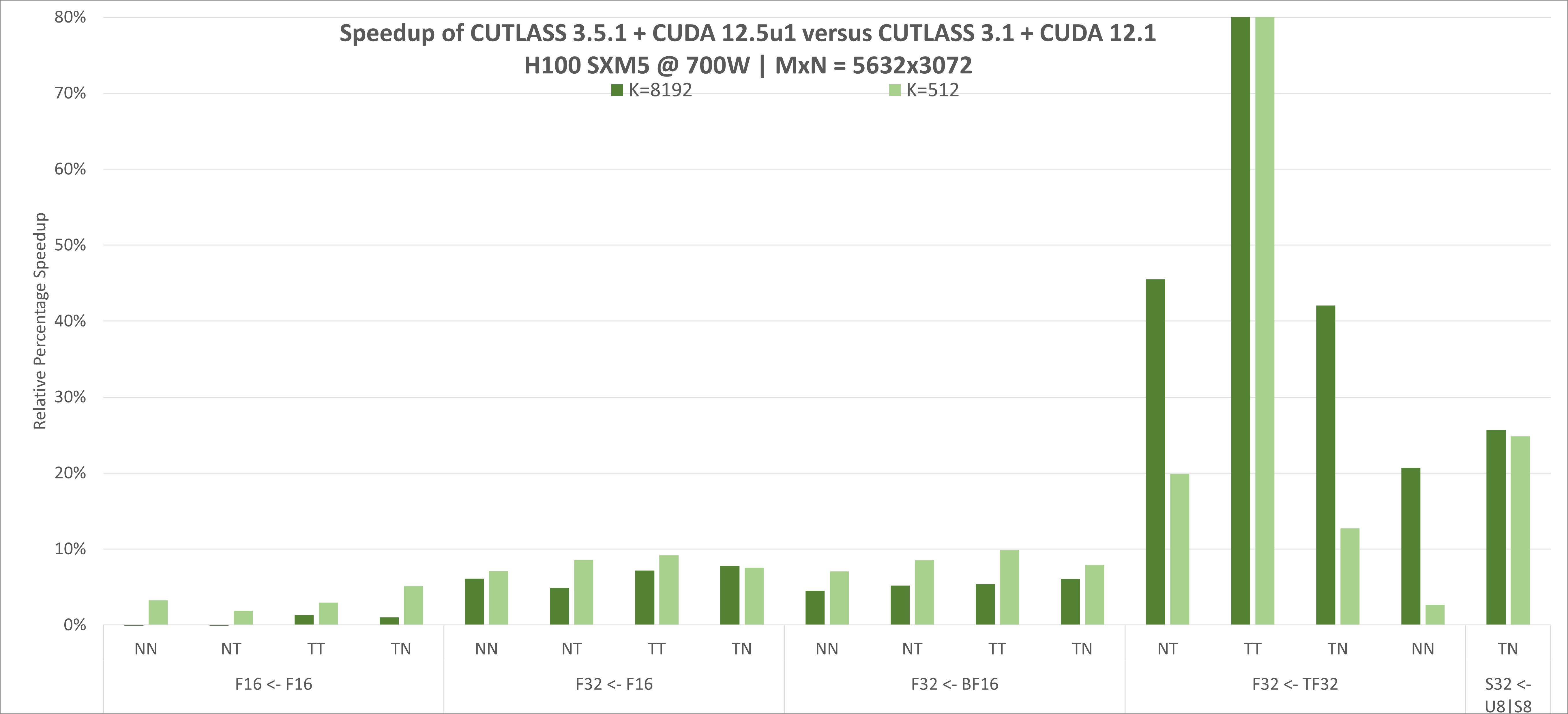 CUTLASS primitives are very efficient. When used to construct device-wide GEMM kernels, they exhibit peak performance comparable to cuBLAS for scalar GEMM computations. The above figure shows the continual CUTLASS performance improvements on an NVIDIA H100 (NVIDIA Hopper architecture) since CUTLASS 3.1. CUTLASS 3.5.1 was compiled with the CUDA 12.5u1 Toolkit. Tensor Core operations are implemented using CUDA's mma and wgmma instructions.